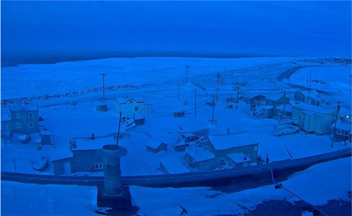 Este fenómeno, conocido como “noche polar”, significa que la ciudad entra en un periodo prolongado de oscuridad. Lo poco de luz que se ve durante esos días suele ser un tenue crepúsculo al mediodía, llamado “hora azul”— luz difusa, fría y fugaz, pero suficiente para distinguir el día de la noche.